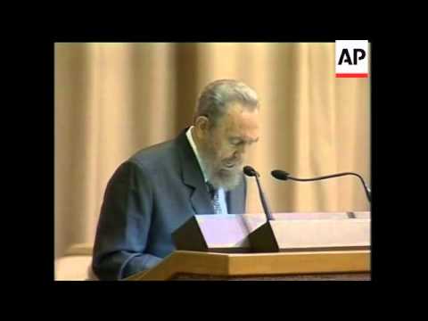 Fidel Castro Saddam Hussein }}- (30 Jan 2003) 1. Wide shot interior Palacio de las Convenciones 2. Mid shot Palacio 3. Mid shot Fidel Castro and Danielle Mitterand 4. Cutaway audience 5.